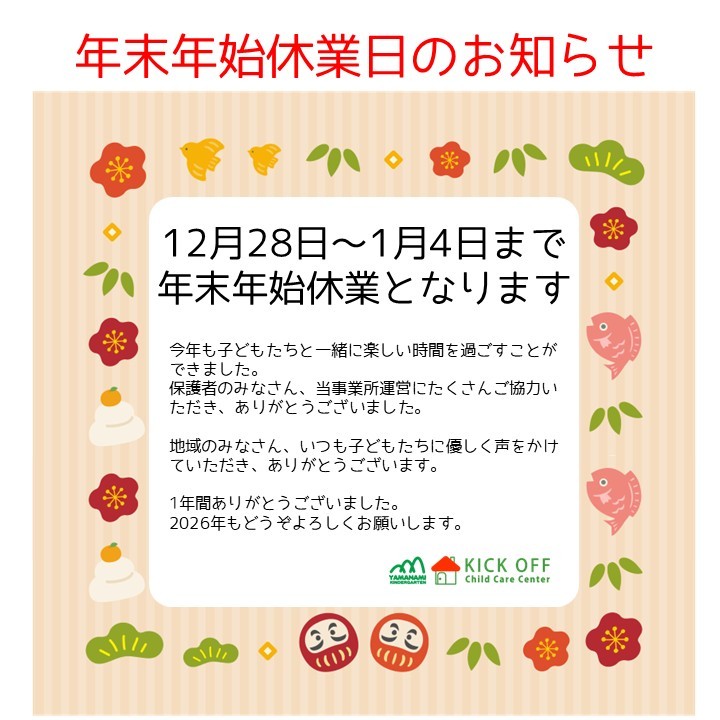 12月28日~1月4日まで年末年始休業となります